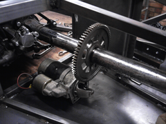 toothed belt and pulley to give the desired gear reduction, but the pulley on the propshaft ran on a large 1 way bearing. even had a speed control on
