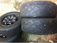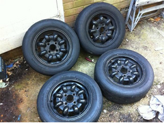 13” Minilite copies, painted black, tatty in places. 4x100 PCD, ET35 (possibly 38). Come with a “used” set of Yoko 032 trackday tyres that between