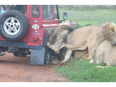 Should have stuck it in gear and started moving... I don't think Mr Leo would have continued chewing with a dislocated paw wrapped around the