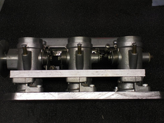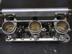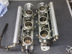 Claire managed to get my throttle bodies to me. These are 2 lots of Triumph triple 595 bodies on custom alloy manifolds, spaced to the KLDE ports and