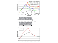 The top graph shows the silencer with no packing (black and grey) and with packing (the other colours). It shows the affect of porosity (the number of