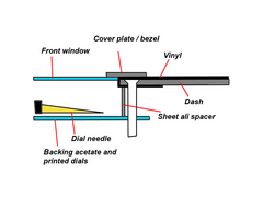 I had decided the front windows of the instruments would be inline with the main dash and therefore to fit the needles in between them and the printed backing a set of spacers would be made. Heres a nice crude image to show a cut through the side of an instrument....